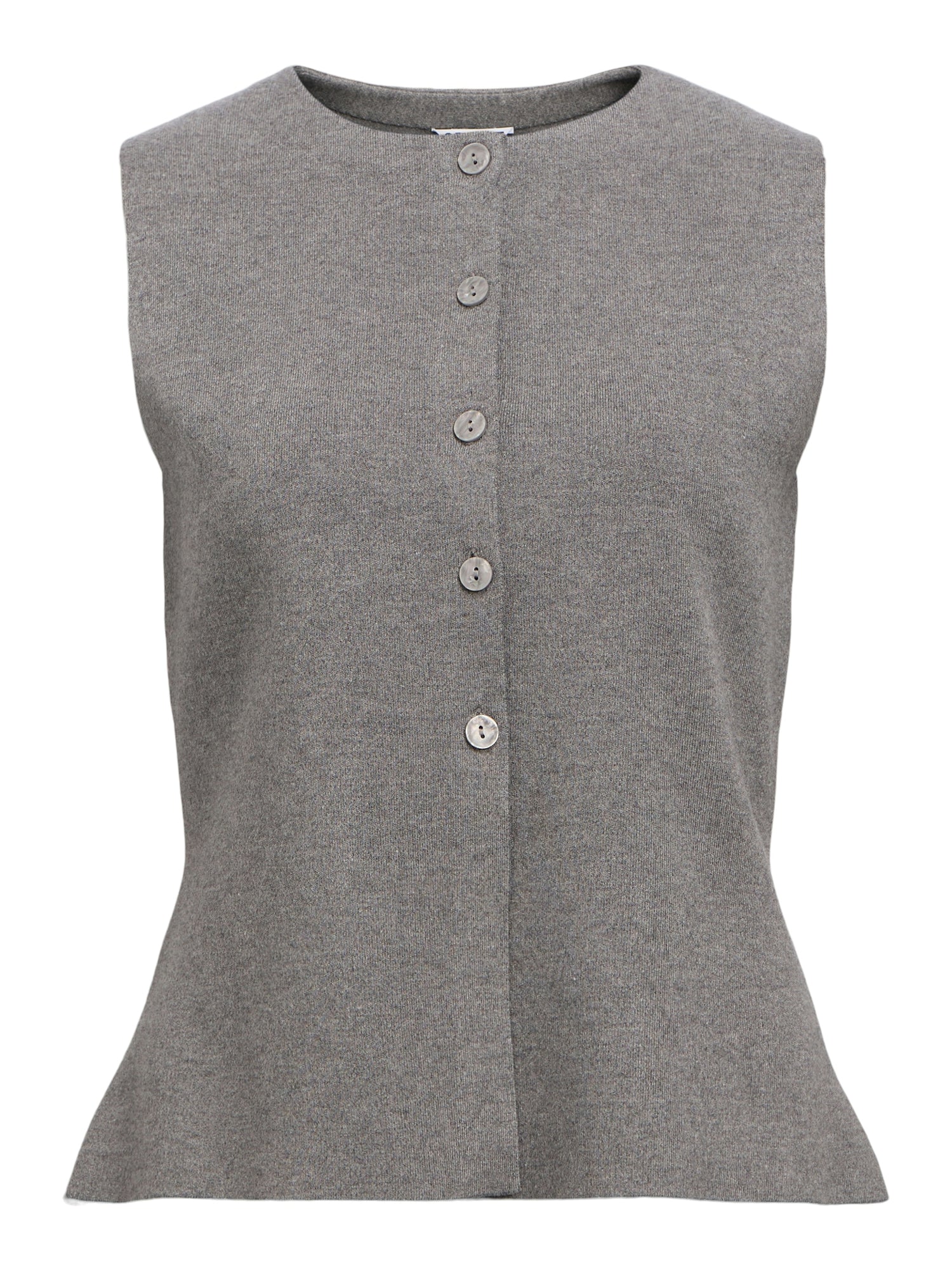 CHALECO DE PUNTO, CUELLO REDONDO, BOTONES EN LA PARTE DELANTERA,BAJO ACAMPANADO, CORTE REGULAR COLOR GRIS MEDIO.